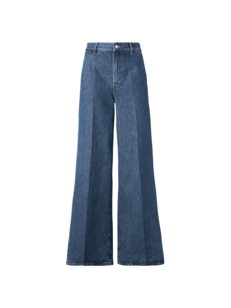 Pantalón vaquero en azul medio, confeccionado en denim rígido, con diseño recto y detalle de cintura cruzada.